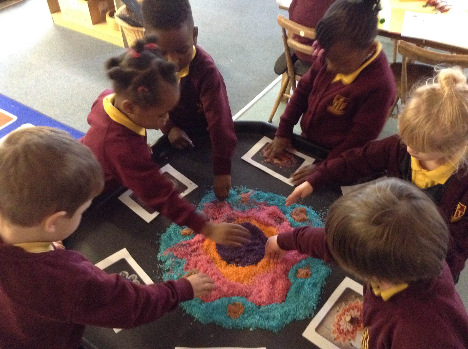 We heard about the celebration of Diwali through the sharing of pictures. We compared it to some celebrations we have across the year - Christmas and Easter. The children got to explore Rangoli patterns and got to try creating their own. Some children chose to create a diya lamp using bright colours and gems.
