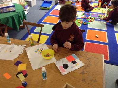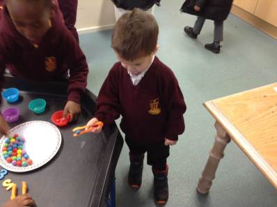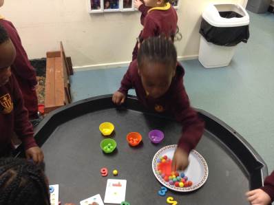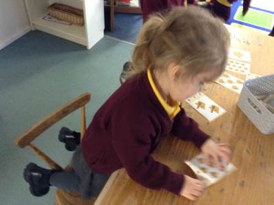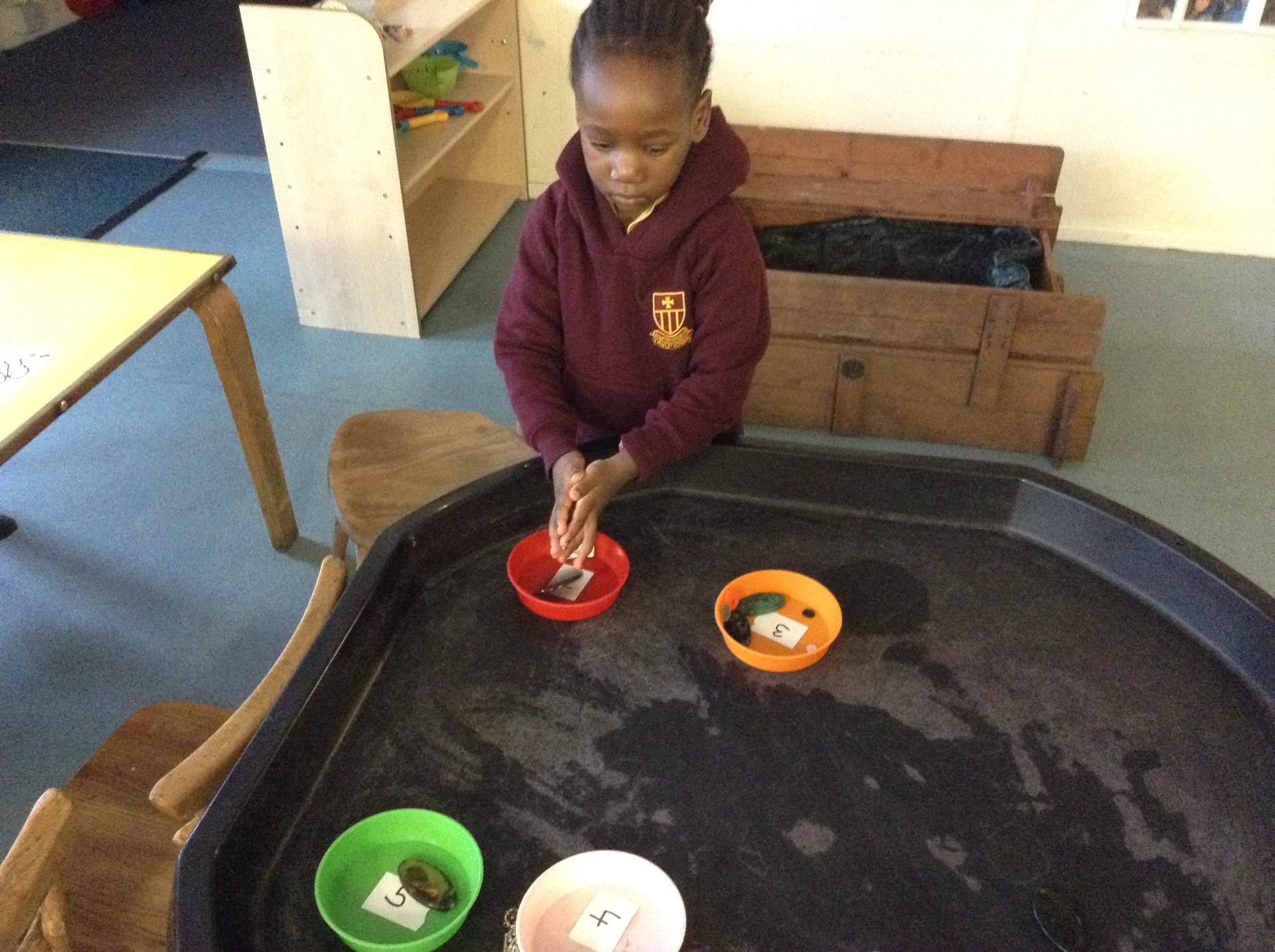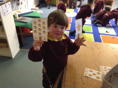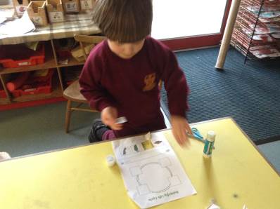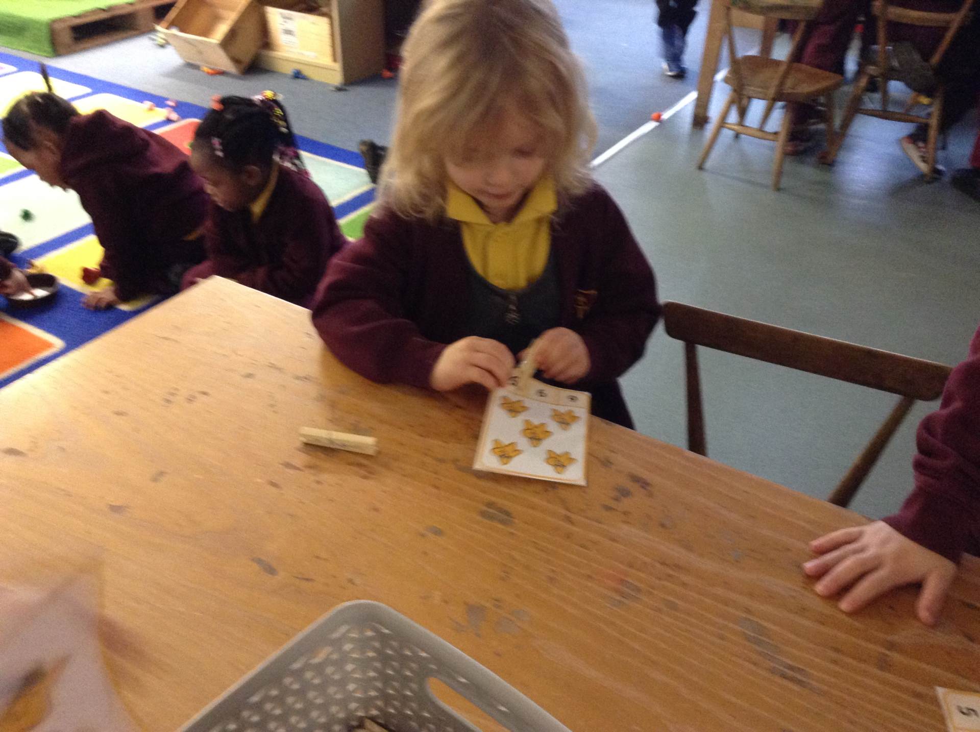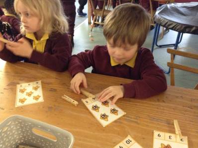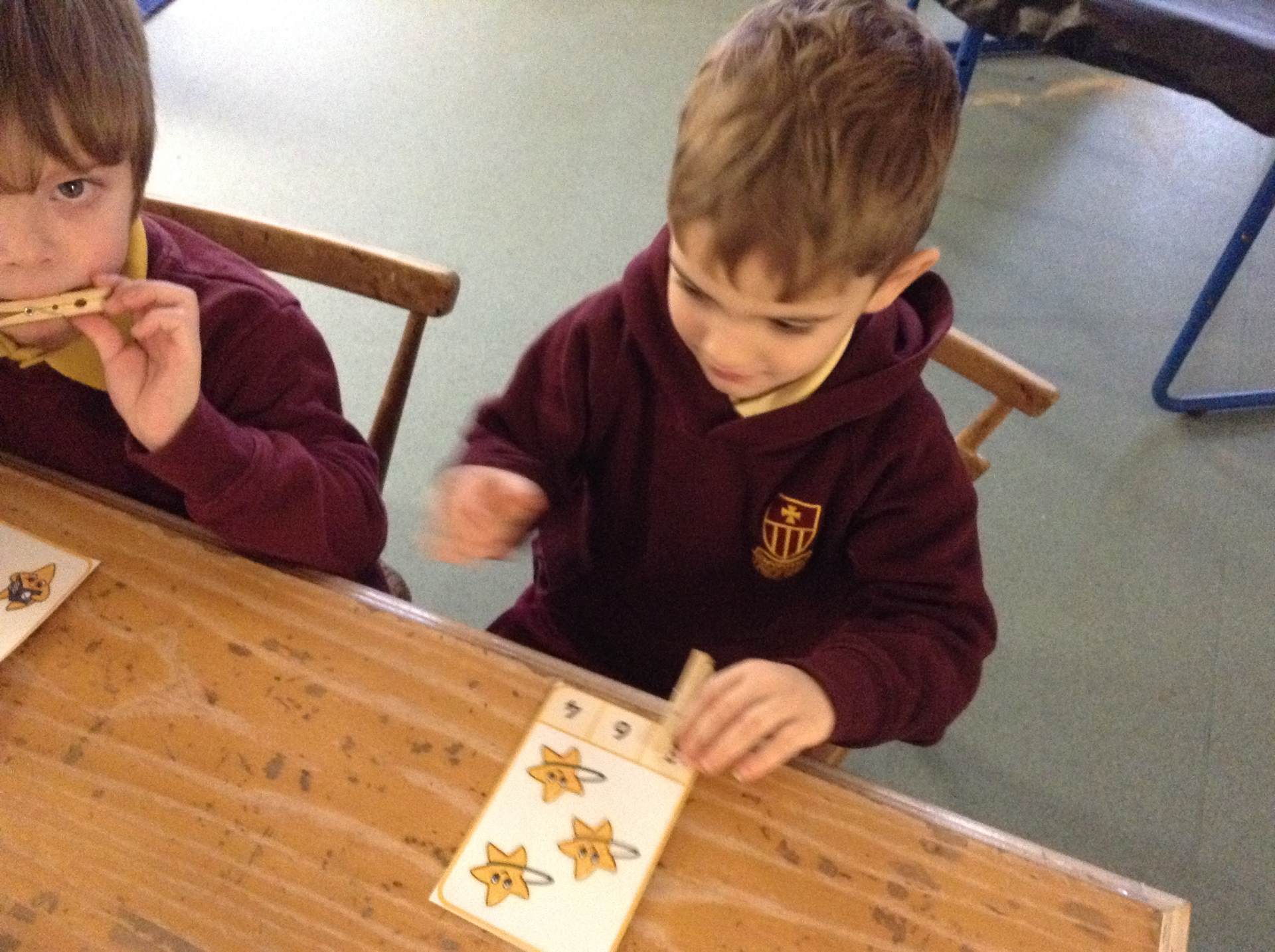 In maths we looked at number 5, we sang counting songs to practise rote counting to 5 and then practised counting out the amount of objects. The children then counted the amount and pegged the correct number.