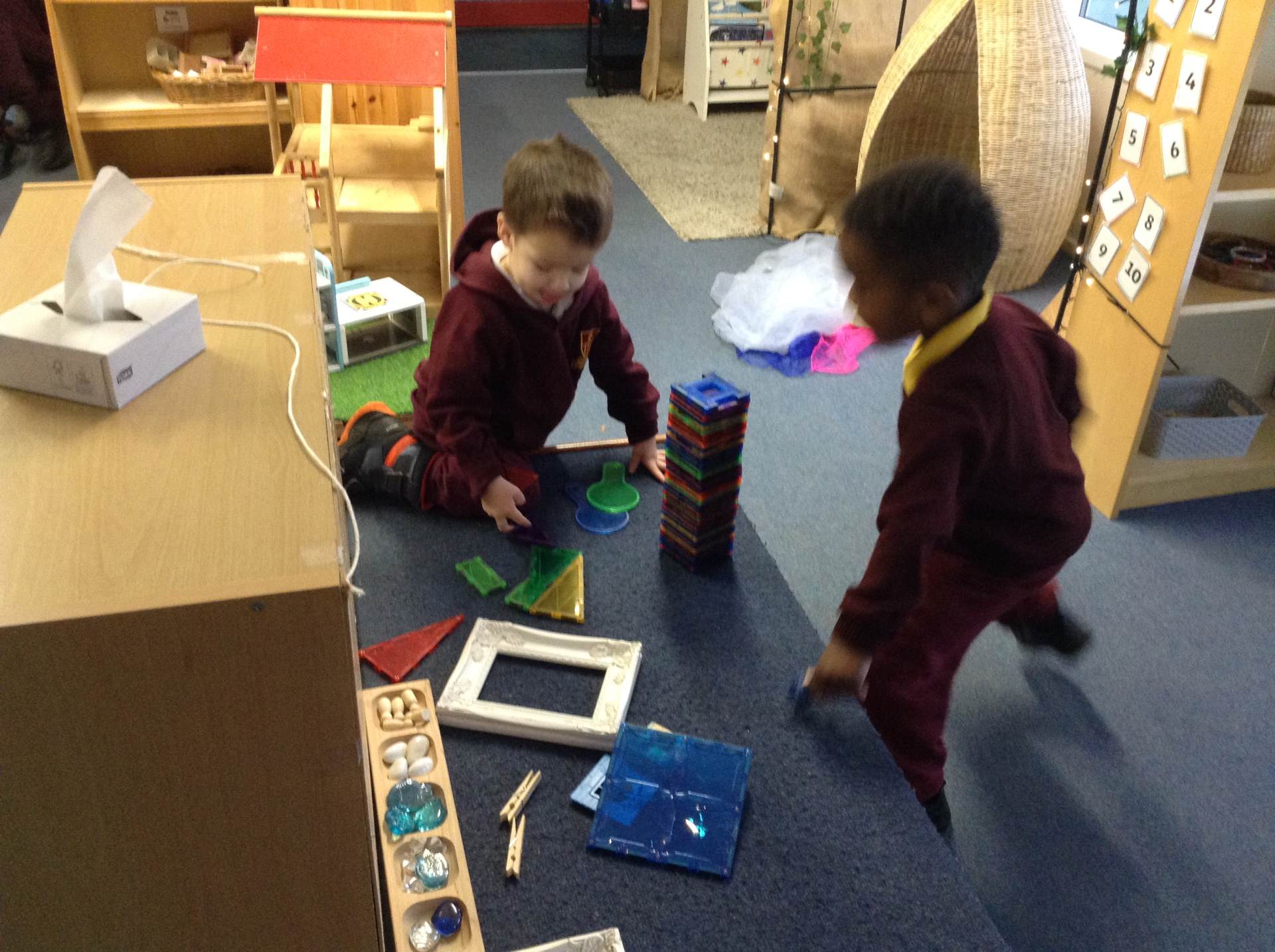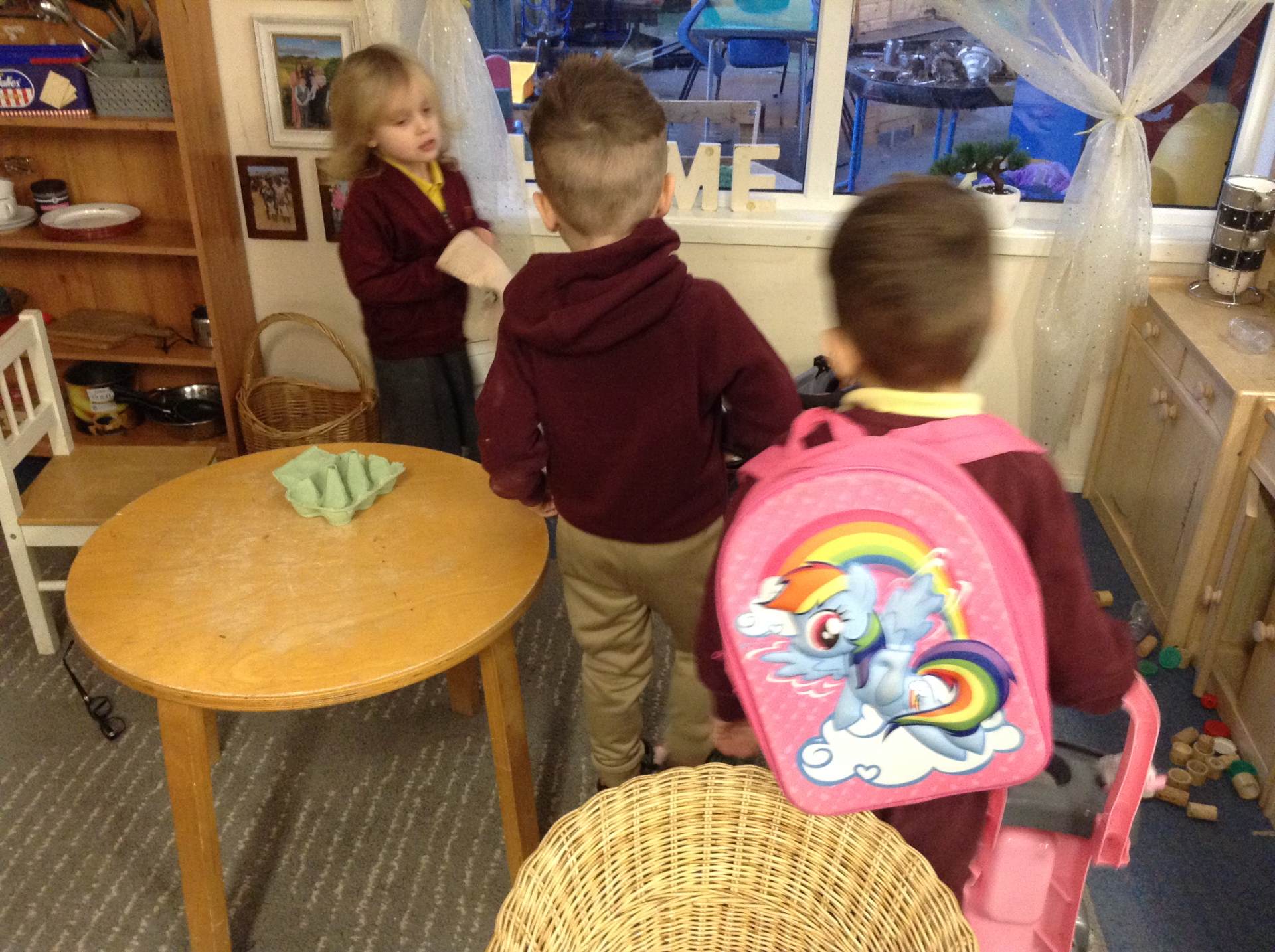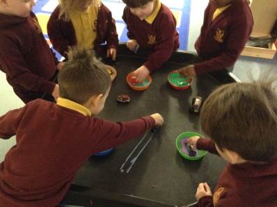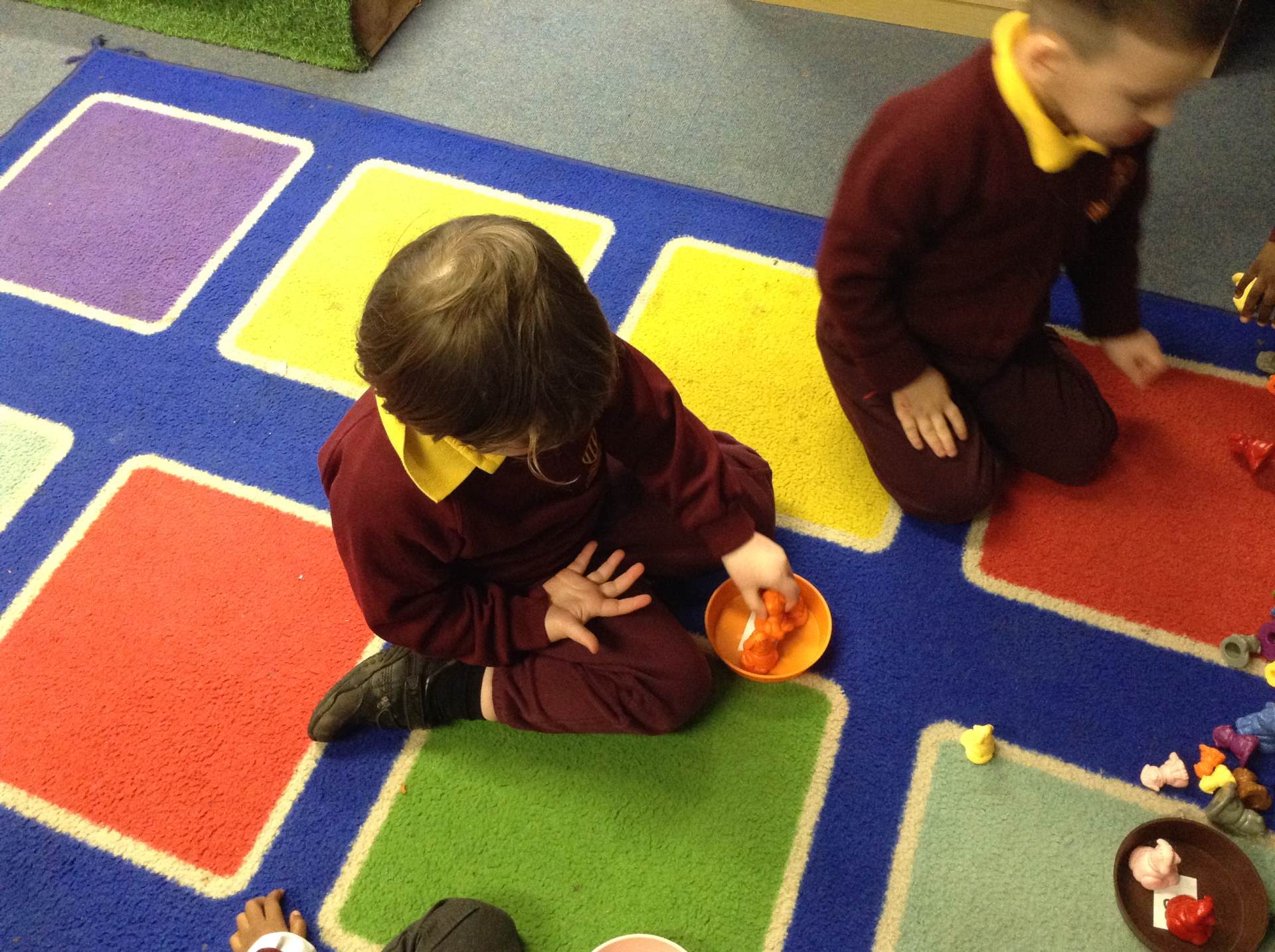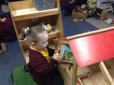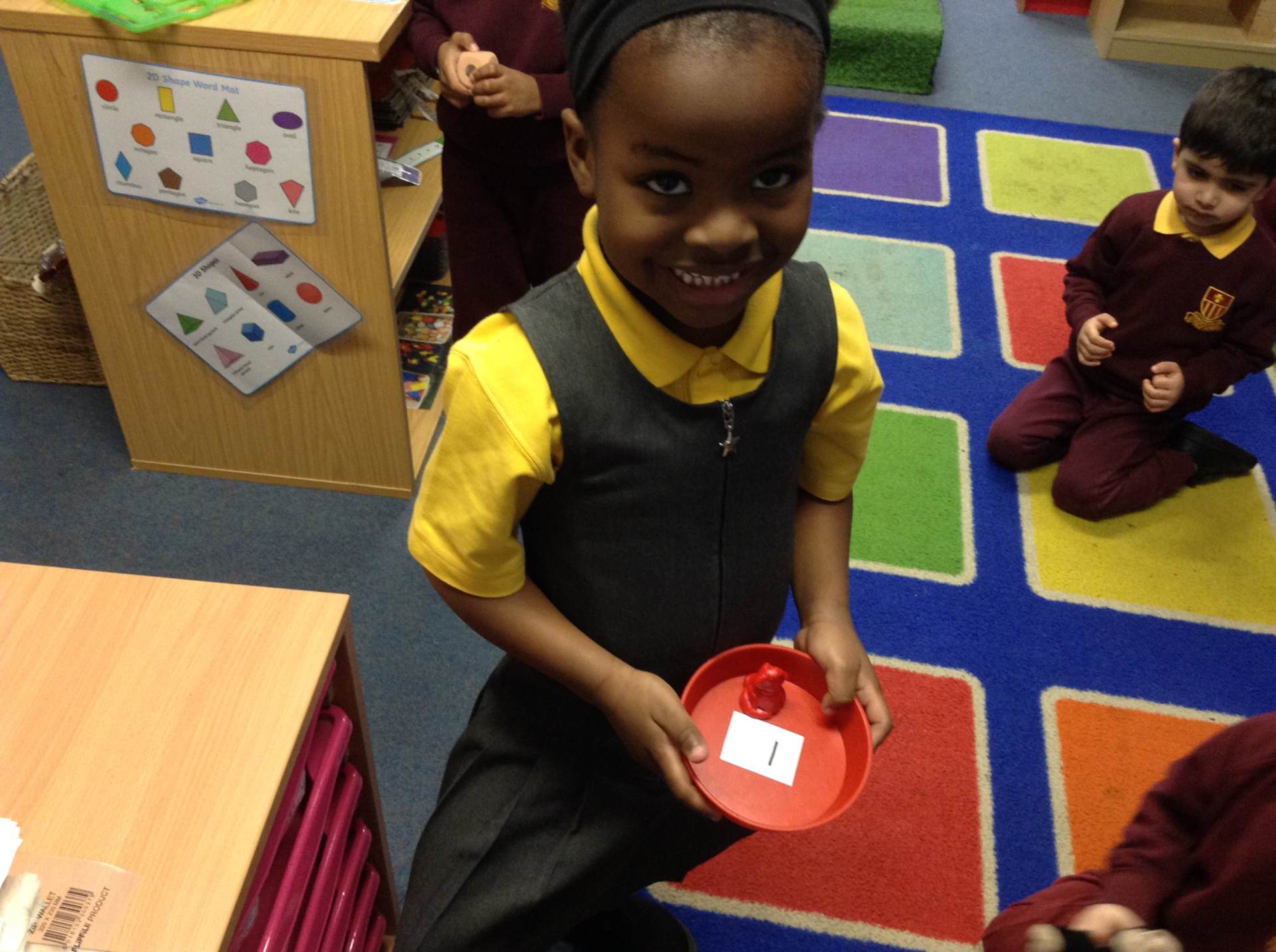 In maths we looked at number 5, we sang counting songs to practise rote counting to 5 and then practised counting out the amount of objects. The children then counted the amount and pegged the correct number.