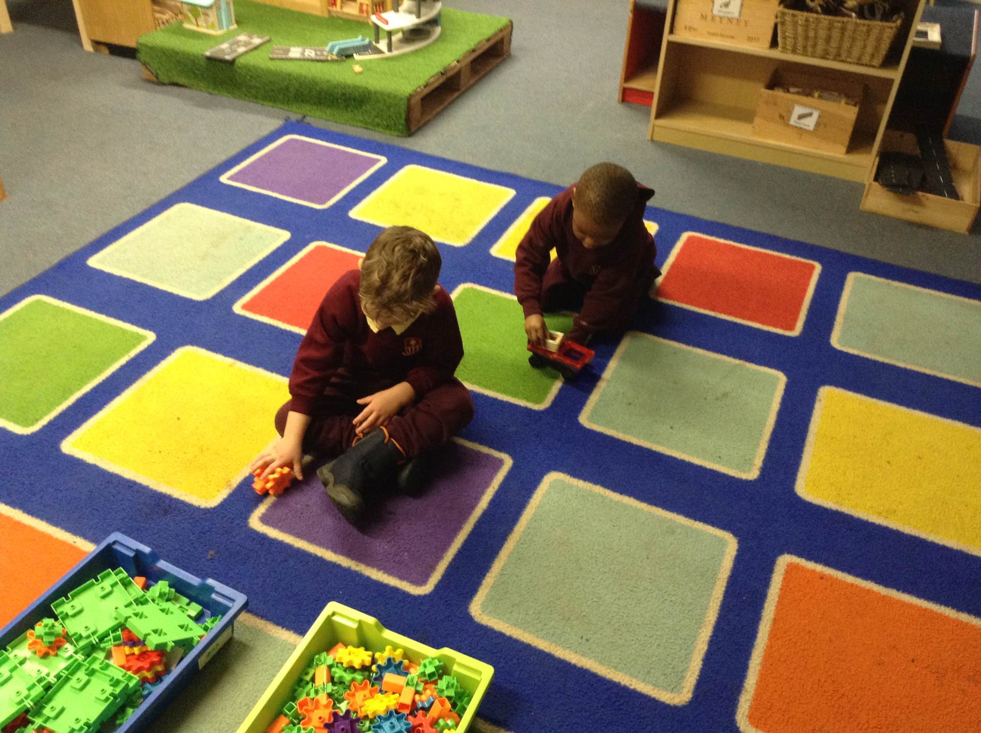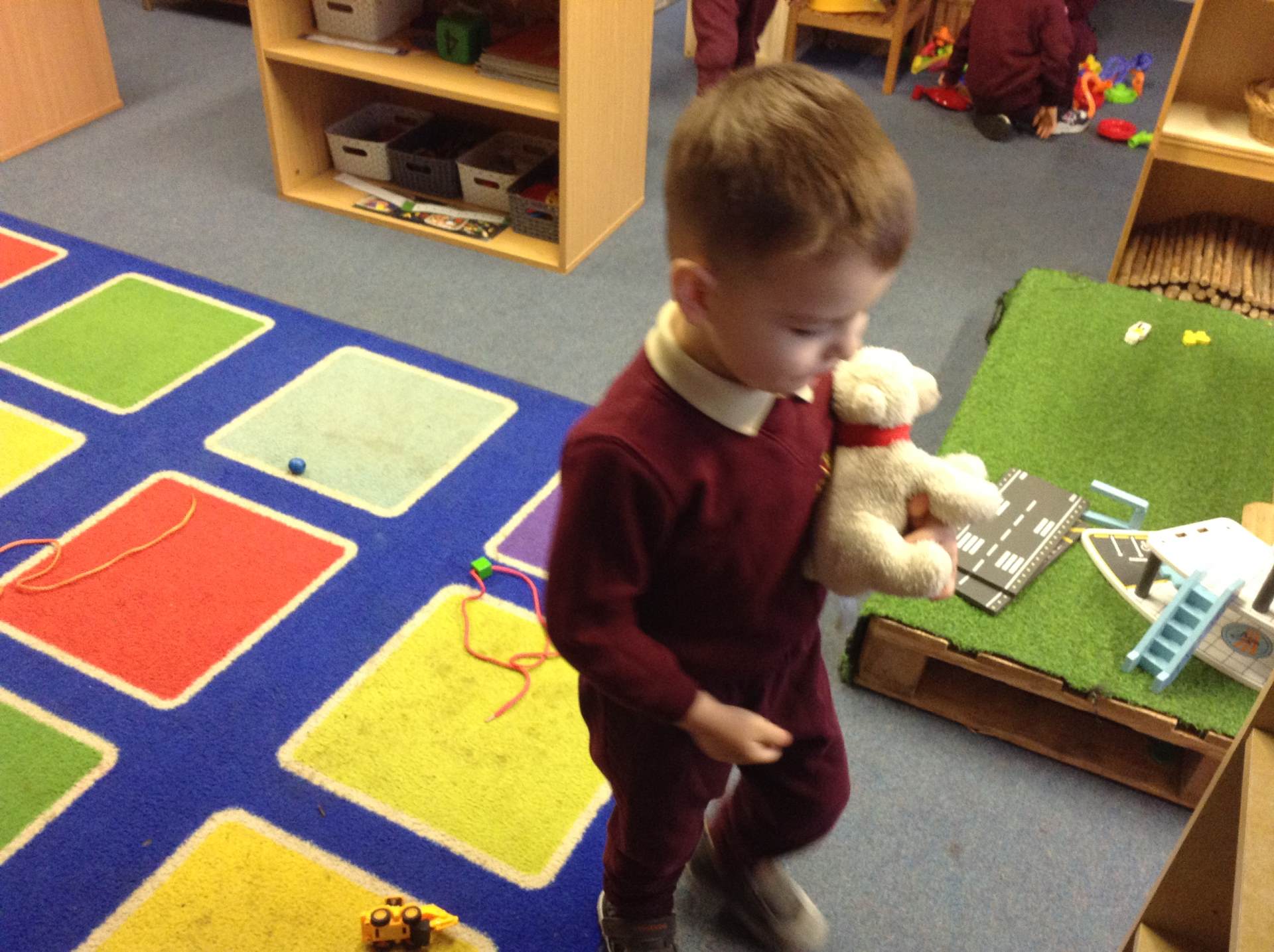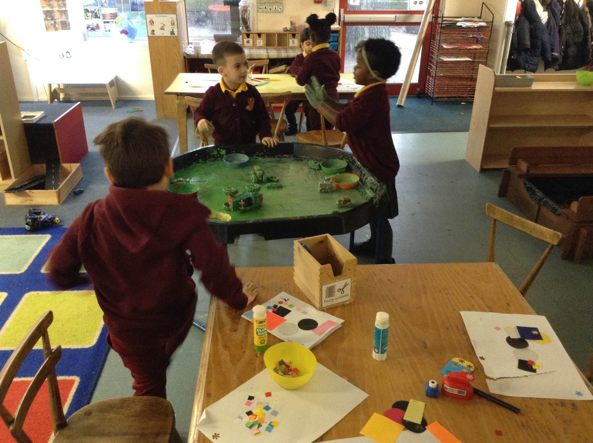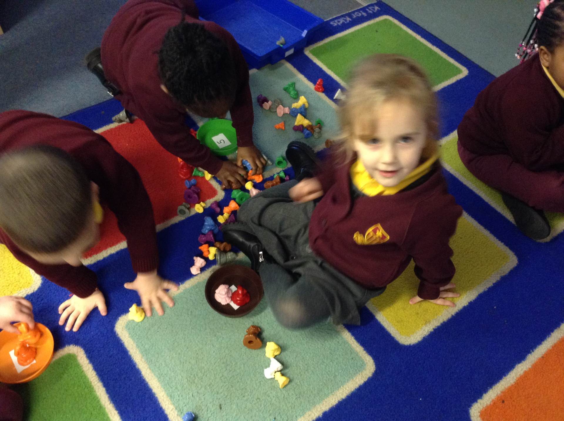 In maths we looked at number 5, we sang counting songs to practise rote counting to 5 and then practised counting out the amount of objects. The children then counted the amount and pegged the correct number.