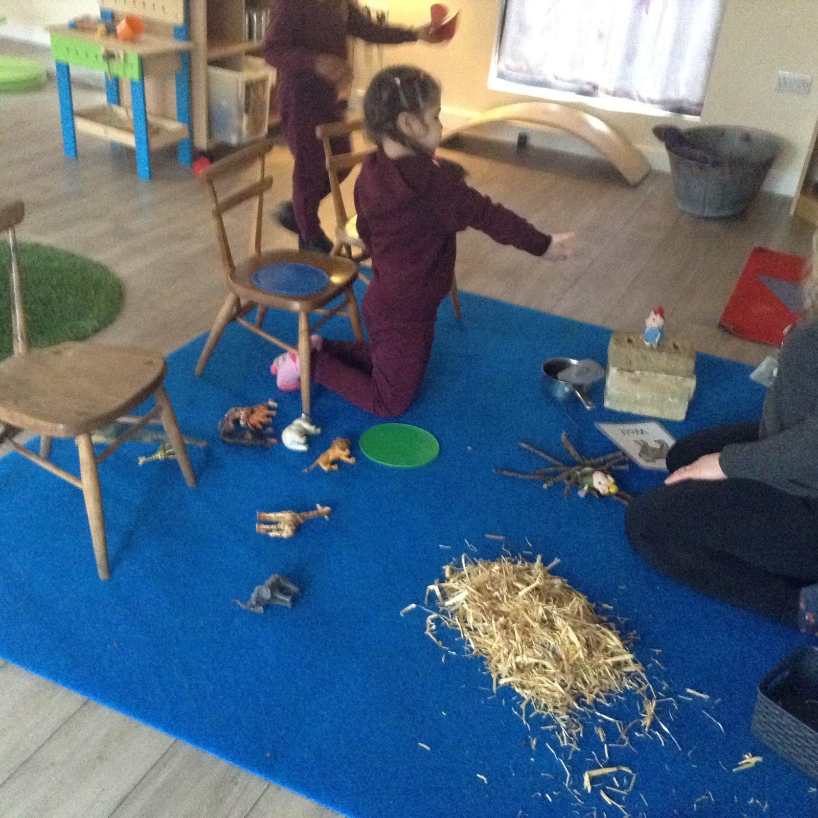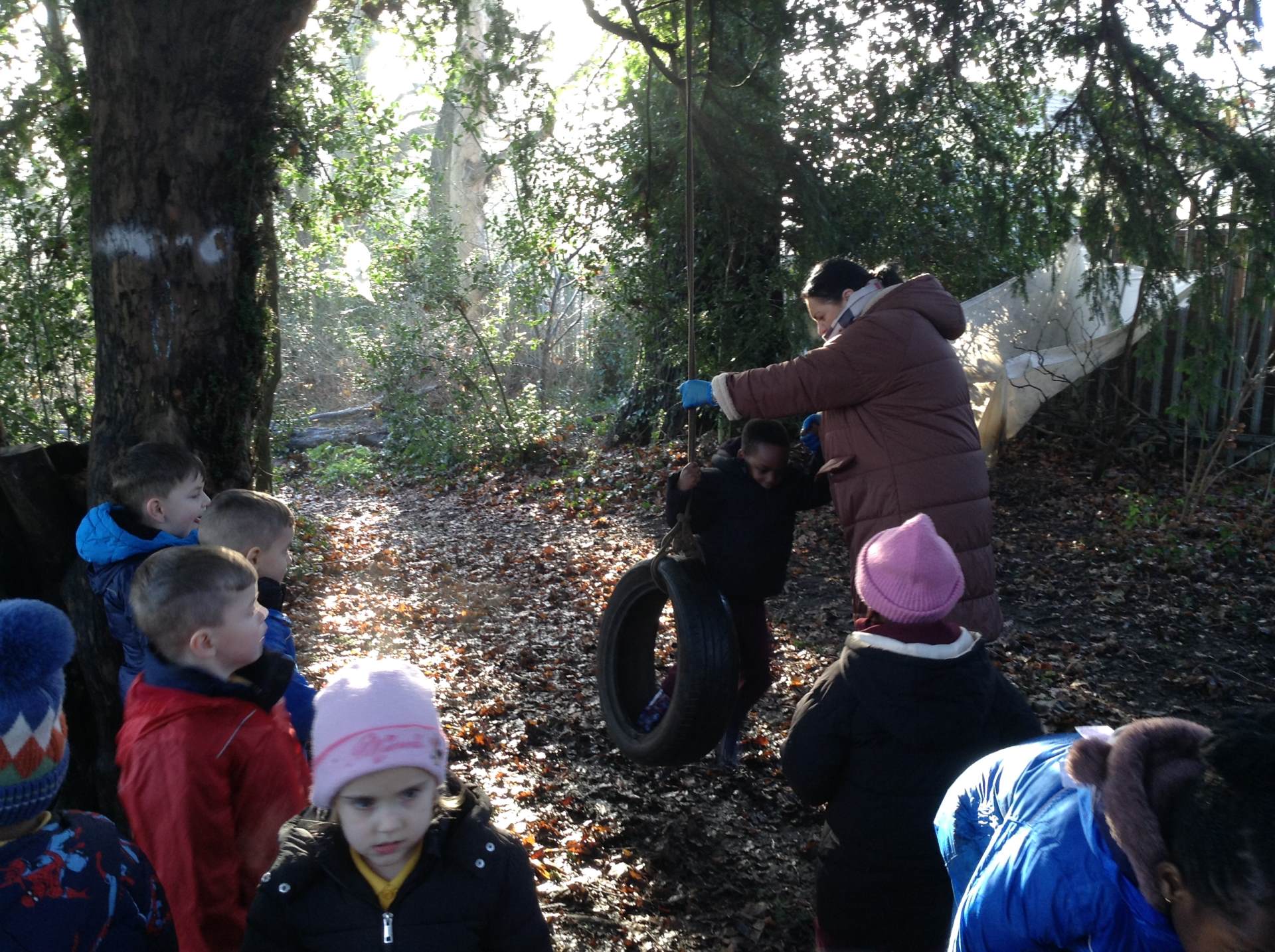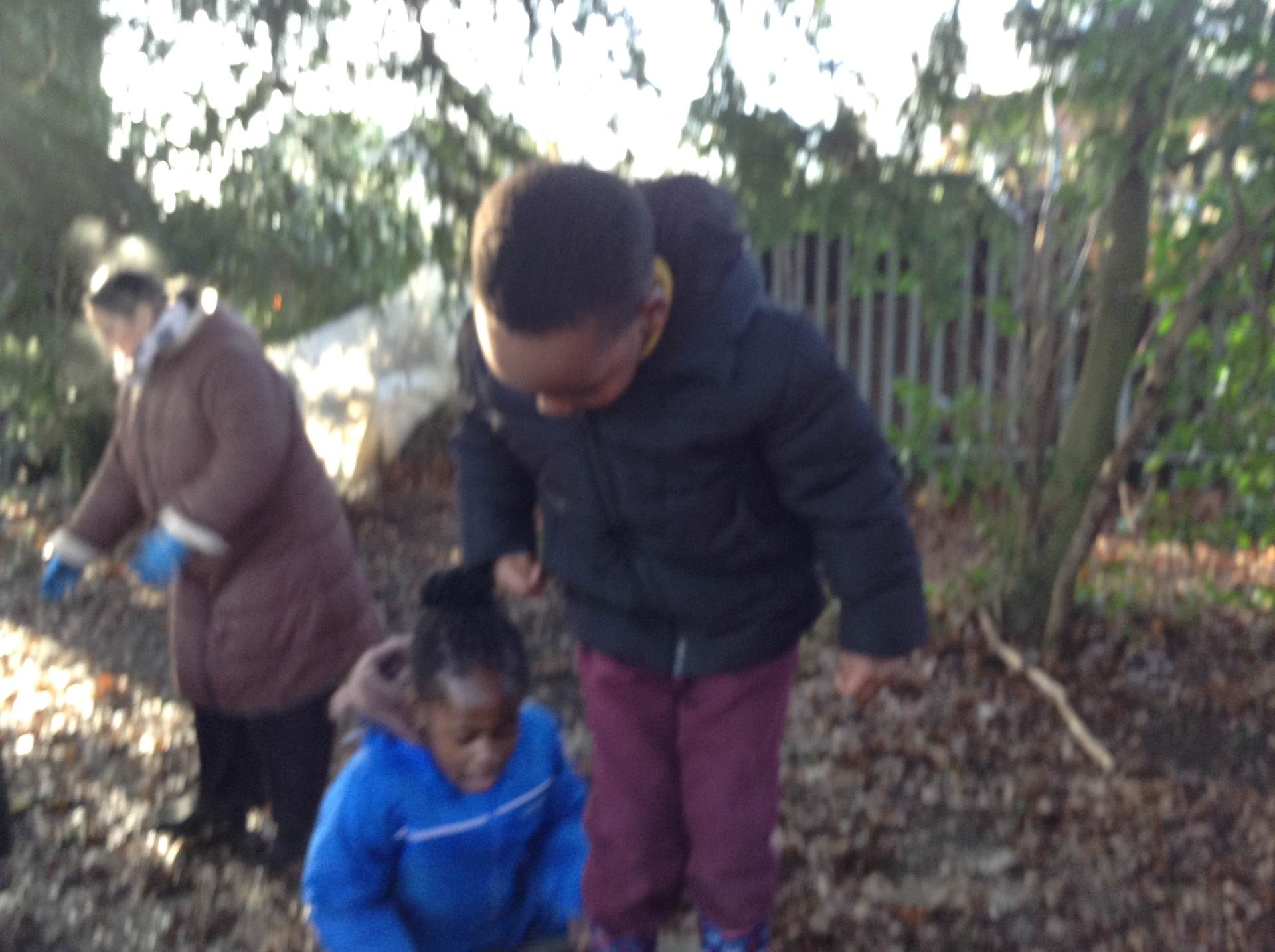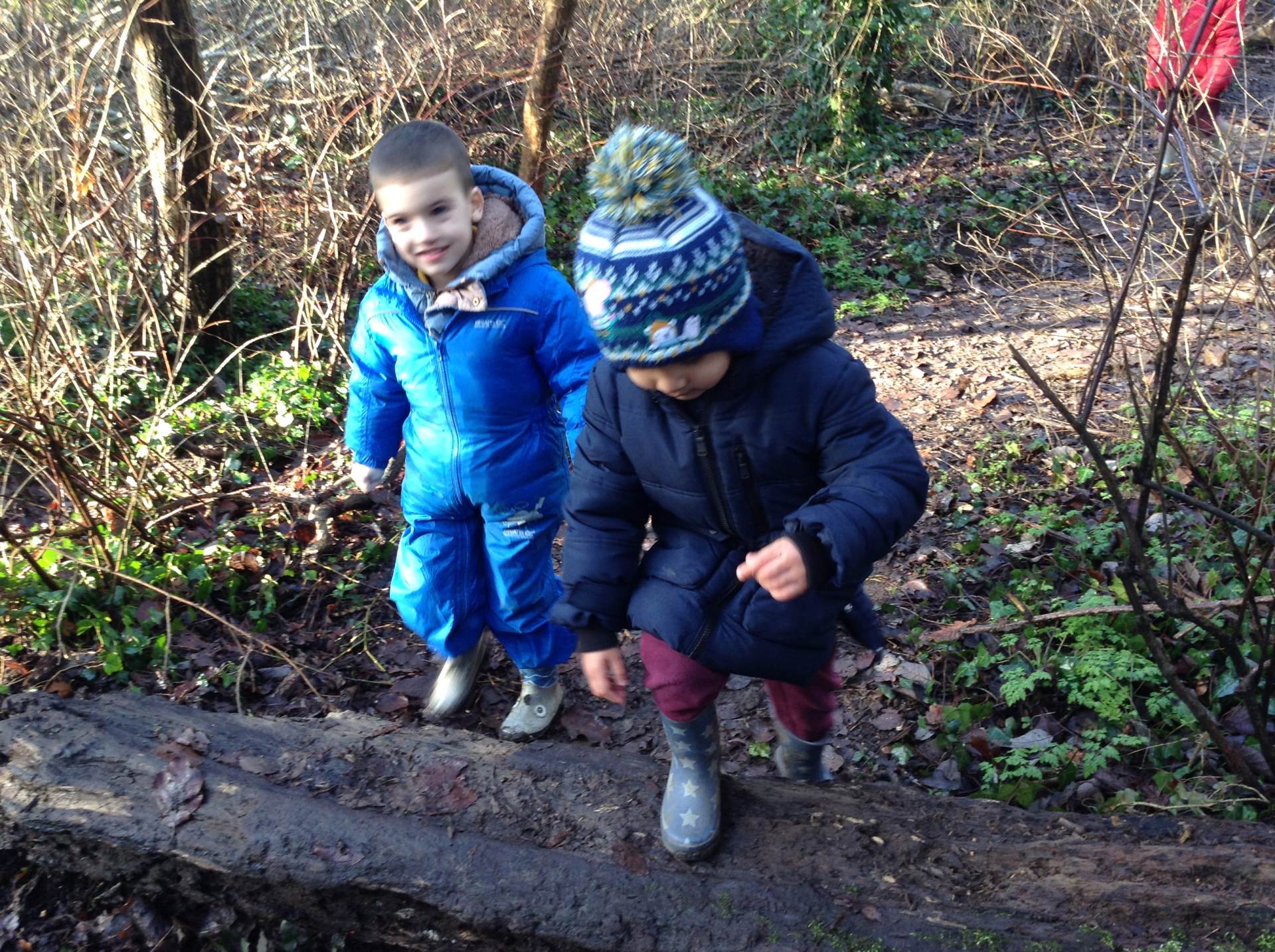 In Forest school, we spent the time exploring, encouraging the children to try different routes, climb over trees and jump down from logs and stumps. It was very messy but very fun!