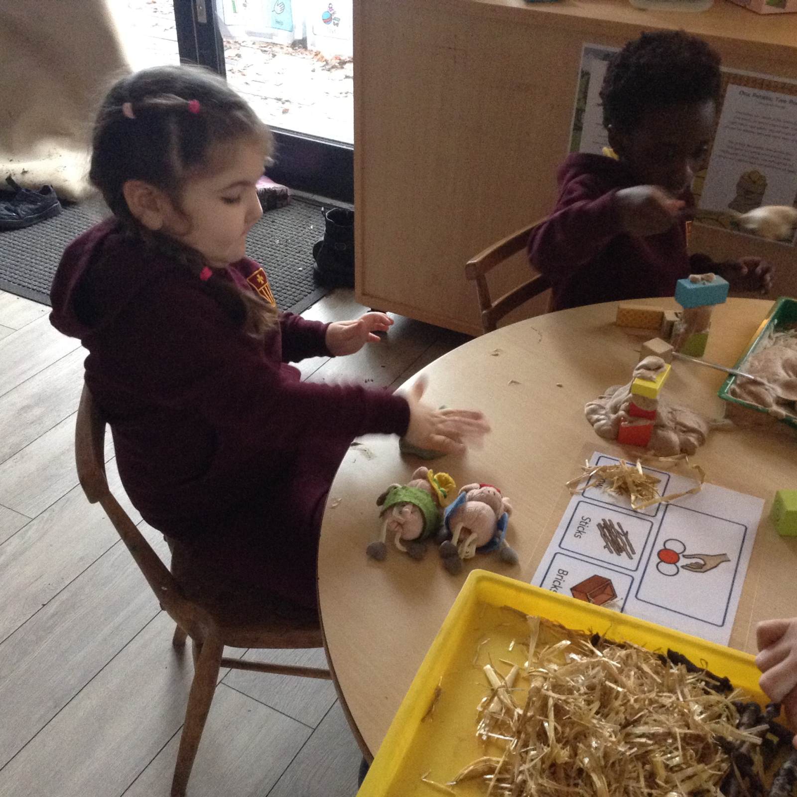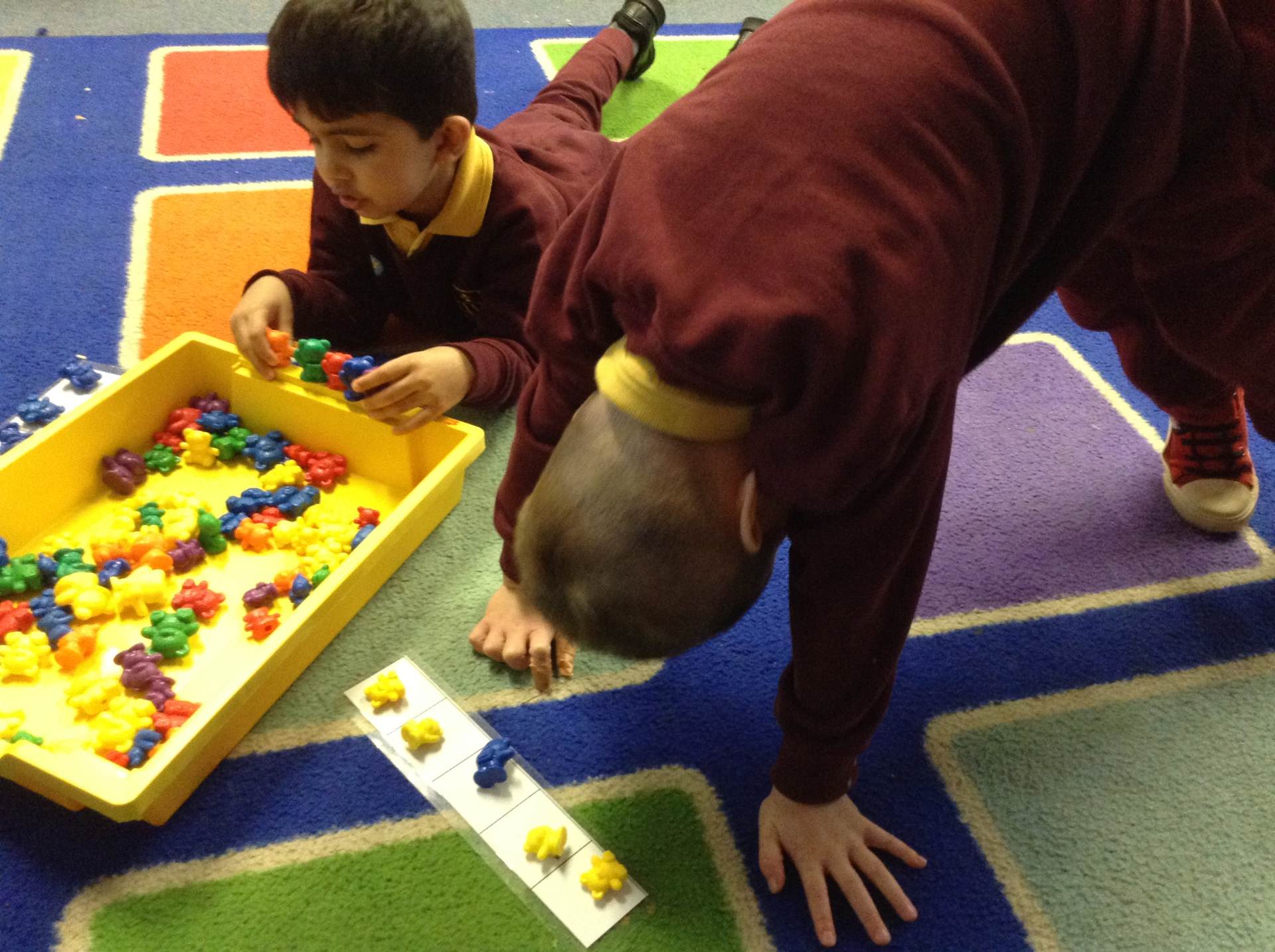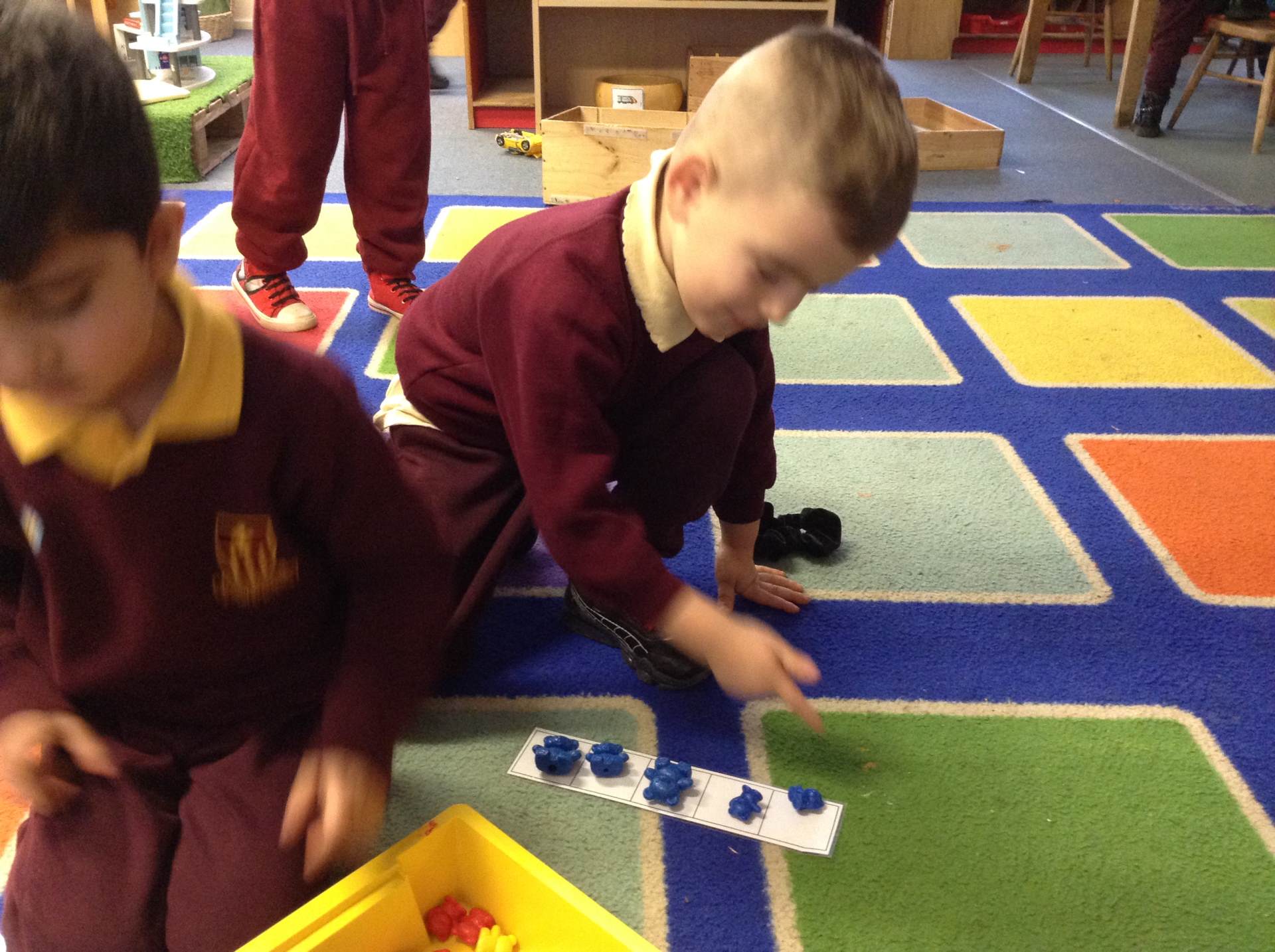 In maths we looked at the composition of number 5. What different ways can we create 5, what would it look like if we shared 5? The children had a go at doing this practically in the environment.